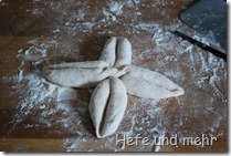 Bei dem Brötchen habe ich auf den eleganten Schwung von Susans Broten verzichtet, weil mir die Teilbrötchen dann zu dünn geworden wären. Daher nenne ich sie auch lieber Windmühlen-Brötchen.