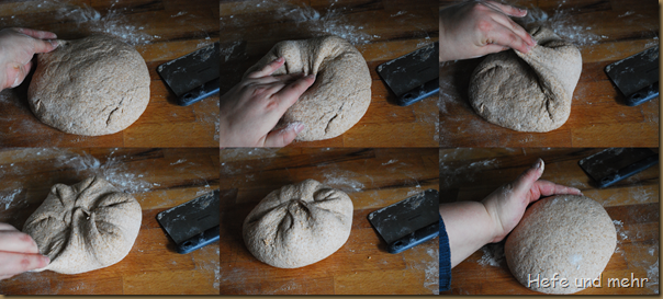 Nun den Teig halbieren und locker zu zwei Kugeln formen. Die Kugeln abdecken und für 10 min entspannen lassen. Nun wird das Brot geformt. rundes brotDazu werden die Kugeln etwas flachgedrückt und dann  der Teig von allen Seiten von aussen in die Mitte gezogen, bis eine straffe Kugel entsteht. Nun wir die Kugel umgedreht und auf den Saum  gesetzt. Als Saum bezeichnet man die Stelle, wo sich beim Formen der Teig in der Mitte trifft (vorletztes Bild). Das Brot wird nun mehrmals zwischen beiden Händen gedreht, während die Hände leicht unter die Kugel ziehen.