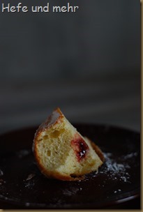 Nach all dem Frittieren und Füllen konnte ich dann endlich den ersten verkosten und war sehr glücklich mit meinen Berliner Ballen. Durch das viele Eigelb wird der Teig besonders zart und flaumig. Der süße Starter bringt einen mildes Aroma und einen guten Trieb. Alternativ kann man aber auch eine Biga als Vorteig verwenden, das hat sich als Ersatz für den süßen Starter bei süßem Gebäck inzwischen bewährt.