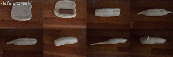Nun den Teig entgasen, in 40g Portionen teilen und zu Kugeln schleifen. 10 min ruhen lassen, dann die Kugeln zu einem Viereck von 10 cm mal 7,5 cm ausrollen. Den Nougatstreifen auf die kurze setzen und straff aufrollen. An beiden Seiten das Brötchen spitz langrollen und die Spitzen auf den Saum legen. Die Brötchen nochmal etwas langrollen, um den Saum zu versiegeln. Die “einfachen” Brötchen sind nun fertig und können auf ein Backblech gesetzt werden. Für die Mäuse die Brötchen auf der einen Seite etwas spitz rollen,  die andere Seite zu einem langen, dünnen Schwänzchen (etwa halb so lang wie der Körper) rollen und diesen in einen Bogen auf den “Mäusekörper” legen.