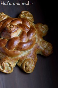 Diesmal habe ich es mit der Reutlinger Mutschel probiert. Um es einfacher zu gestalten, habe ich allerdings kein so “Kunstwerk” produziert, sondern aus dem Teig einen Zopf gemacht.