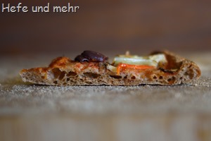 Bei der Vollkornpizza habe ich ein backstarkes Vollkornmehl verwendet, dass durch einen höheren Proteingehalt ungemein viel Wasser binden kann. Normalerweise bestelle ich höchst selten Mehl im Internet, da ich lieber regional in der Mühle einkaufe, aber der höhere Proteingehalt ist für eine Vollkornpizza mit relativ vielen Blasen sehr hilfreich. Wer kein backstarkes Mehl hat, kann aber auch den Wassergehalt reduzieren und zusätzlich ein wenig Flohsamenschale verwenden. Dann sollte die Pizza auch mit “normalen” Vollkornmehl funktionieren. Ansonsten ist es ein schlichter, direkt geführter Teig, der allerdings am Besten sechs Stunden vor sich hin gären darf und dabei immer mal wieder gefaltet wird. Alternativ klappt aber auch eine kalte Gare sehr gut. Das Rezept lässt sich so gut in unseren Familienalltag einbauen.