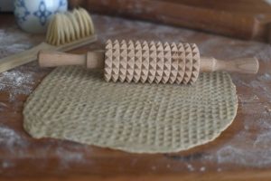 Die Teigkugeln zu Fladen mit einem Durchmesser von 25 cm ausrollen und mit einem “Kruskavel” (schwedisches Nudelholz mit Noppen) oder einer Stipprolle darüber rollen. Wer keine Stipprolle hat, nimmt einfach eine Gabel und sticht den Teig mehrfach ein.