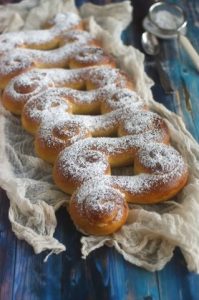 Den Teig in 8 Stücke teilen (je ca. 120g) und zu Teigstränge rollen (55cm lang). Die Teigstränge sollten in der Mitte etwas dicker sein als an den Enden. Von beiden Enden gegengleich aufrollen (wie für ein “S”), so dass in der Mitte ein “Steg” von etwa 10 cm stehen bleibt. Auf ein Backblech setzen, so dass eine Leiter entsteht.