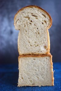 Für schöne Bilder hatte die Zeit aber nicht gereicht, und so war klar (und vom Rest der Familie sehr befürwortet), dass ich es sehr bald nochmal backe. Bei Runde zwei habe ich ein ganz klein wenig Feinheiten angepasst, was zur Folge hatte, dass die Brote noch schöner aufgingen und eine noch wattigere Krume hatten. Dumm nur, dass die Teigmenge jetzt für die Formen deutlich zu viel war, was mich direkt eine dritte Runde backen ließ. Und bei Runde drei klappte alles wie geplant: Teigmenge perfekt, Krume wunderbar langfaserig und leicht wie eine Wolke, ein feines, ausbalanciertes Aroma. Zudem lässt sich das Brot auch noch perfekt toasten und ist damit die eine hervorragende Grundlage für gegrillte Käse-Sandwiches. Bei uns ist es im Moment ein “Must have” im Gefrierschrank und kaum gebacken auch schon wieder aufgegessen.