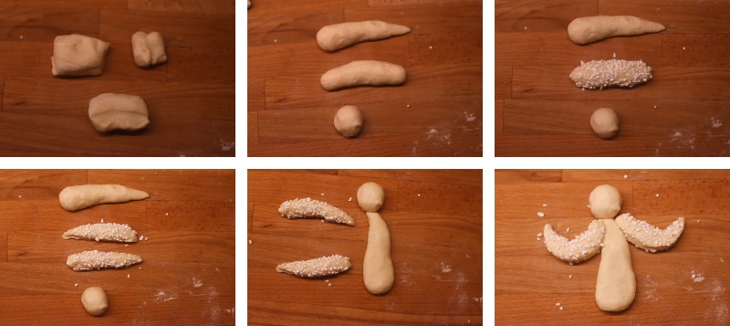 Für jeden Engel benötigt man ein 15g-Stück (Kopf) und zwei 35g-Stücke (Körper und Flügel). Das Teigstück für den Kopf rund schleifen. Das Teigstück für den Körper zu einer Tropfenform mit ca. 12 cm Länge rollen. Das geht am leichtesten, indem man den Teig erst rund schleift, kurz entspannen lässt und dann an einer Seite langrollt. Den Tropfen etwas flachdrücken. Das Teigstück für die Flügel wird zu einem kurzen Teigstrang von 8 cm Länge gerollt, in Hagelzucker gewälzt und diagonal durchgeschnitten. Dadurch entsteht ein spitzes Ende (Flügelspitze) und ein abgerundetes, dickes Ende (Flügel-Oberseite).