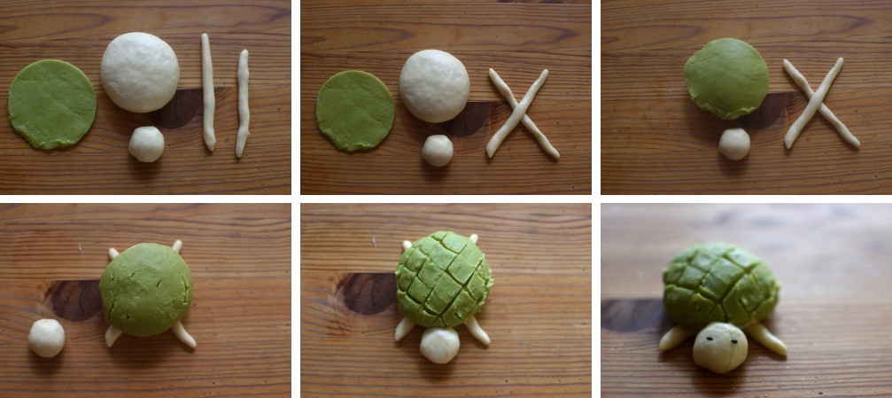 Den Anfang machen diese kleinen Schildkröten. Wie bei den südamerikanischen Concha und den japanischen Melon Pans wird der Panzer der Schildkröten-Brötchen aus knusprigen Mürbeteig gebildet. Die grüne Farbe kommt dabei von einer kleinen Portion Matcha-Pulver. Die Schildkrötenform ist ziemlich einfach und darum auch für Kinder im Vorschul-/Grundschulalter gut geeignet. Nur beim Einschneiden des Mürbeteigpanzer braucht es dann evtl.ein wenig Hilfe.