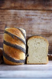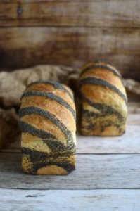 Nun den Teig  dritteln und 10 min entspannen lassen, dann zu länglichen Broten formen. Die Oberseite mit Wasser befeuchten und in Mohn wälzen. Die Brote mit der Saumseite nach unten in gefettete Kastenformen (500g) geben und mehrfach diagonal einschneiden.