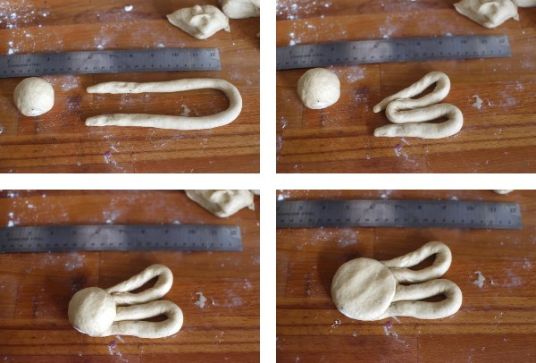 Den Teig in 20 Portionen von jeweils etwa 45g teilen. Für den Kopf wird jeweils ein Teigstück rundgeschliffen (Anleitung s. hier) und ein Teigstück zu einem Teigstrang von ca. 32 cm gerollt. Der Teigstrang wird in die Form eines “M” gelegt und dann am unteren Ende etwas zusammengeschoben. Die Teigkugel wird auf das untere Ende gelegt und etwas flachgedrückt.