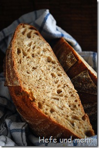 Da muss ich noch ein wenig üben, und auch sonst hab ich wirklich nicht alles optimal gemacht (der Teig war am Ende zum Formen für mich eigentlich zu weich) — und trotzdem ist das ein richtig tolles Brot geworden! Ganz fluffig innen und ein schön herzhafter, komplexer Geschmack. Dankeschön!!!