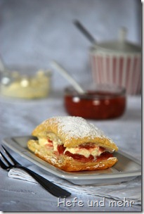 Some recipe ideas develop spontaneously. Like the idea for this cake. It started when my favourite colleague asked me if I had a good recipe for a rhubarb streusel cake. Instantly the custard streusel cake come to my mind. Rhubarb and vanilla pairs so greatly and so I suggested to add another layer to the custard streusel. My colleague liked the idea as well and after a short discussions we decided that the rhubarb should be slightly cooked and then bound with some starch like a custard. When I bought my groceries this evening, I saw rhubarb in the fruit section of the supermarket and decided that I had to bake this cake as well. And I’m happy that I did it, because the combination of rhubarb, custard, streuel and a fluffy yeast dough is really divine!