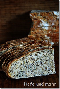 This Sandwich bread is a readers wish. But I needed two rounds, until I was really satisfied. In the first Variant I had a boiled soaker with whole spelt flour and seeds, but this added to much liquid to the dough. This resulted in a very instable crumb. The recipe needed adjustments!