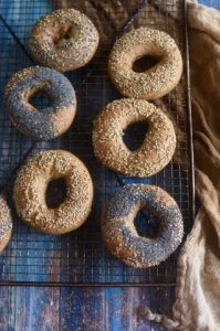 Die Bagel haben eine feine und saftige Krume und schmecken durch die lange Gare sehr fein. Zudem sind sie durch den den deutlich erhöhten Protein- und Ballaststoffanteil gut sättigend und lassen den Blutzucker nur langsam steigen.